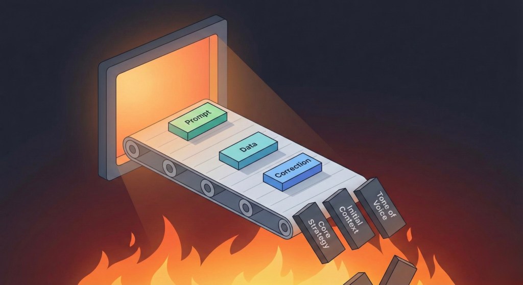 Imagine your conversation is not a chat log, but a conveyor belt leading into a furnace. The AI is the furnace. It can only hold a specific amount of fuel (tokens) at any given second. As you add new prompts, data, and corrections to the front of the belt, the oldest information—usually your core strategy and initial context—falls off the back edge into the abyss.