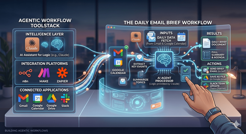 Recently, I have been using this framework myself and experimenting with simple agentic workflows. Following the four steps from last week, and with Claude helping me refine prompts and think through edge cases, I was able to set up a daily email briefing workflow in one afternoon.