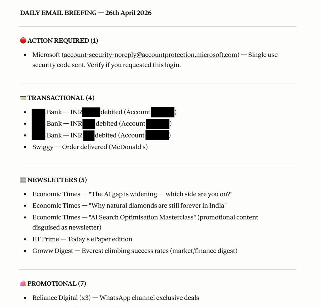 When I got my daily briefing it flagged a Microsoft security code as Action Required and surfaced a society management notice that would have been buried under 15 promotional emails. Both would have cost me time to find manually. The agent found them in seconds.