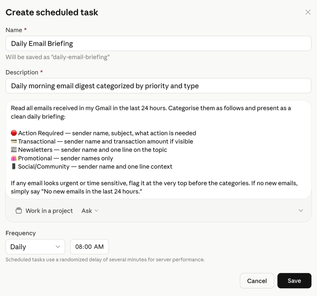 With Cowork’s scheduled tasks, you set it up once. Every morning at 8am, Claude connects to your Gmail, reads the last 24 hours of emails, categorises them, and delivers your briefing. You wake up and the work is already done. You did not trigger it. You did not supervise it. You just open Cowork and the briefing is sitting there waiting for you.