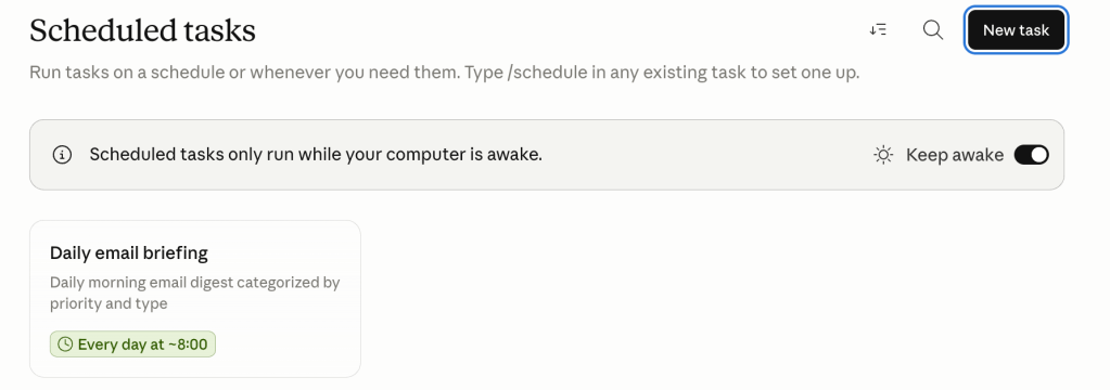 One guardrail I discovered only while setting up the scheduled task: Claude Cowork scheduled tasks only run while your computer is awake. That is not a bug. That is a production reality you need to design around. If your Mac goes to sleep before 8am, your briefing does not run.